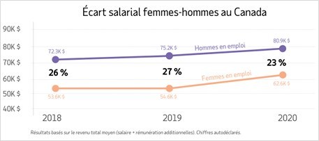 Les résultats de l'enquête, qui se basent sur des montants autodéclarés, montrent que le revenu total des femmes est toujours de 23 % inférieur à celui des hommes (salaire avant impôt et autres rémunérations compris). Les salaires avant impôt des femmes demeurent de 21 % inférieurs à ceux des hommes, tandis que c'est au niveau des rémunérations additionnelles variables, telles que les primes, l'intéressement aux bénéfices ou les accords sur l'équité, que la disparité éclate : les travailleuses canadiennes ont gagné 43 % de rémunérations additionnelles en moins que les hommes en 2020. Bien que ces résultats soulignent une légère amélioration comparativement à ceux recueillis l'année dernière - les femmes ayant rapporté gagner 24 % de salaire et 57 % de rémunérations additionnelles en moins en 2019 - il n'en reste pas moins que les employeurs ont encore du travail à faire pour garantir une rémunération équitable à tous les employés.